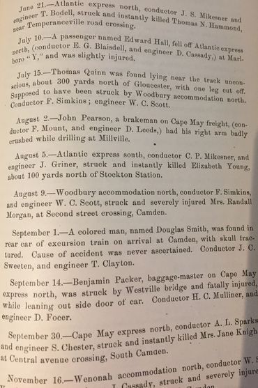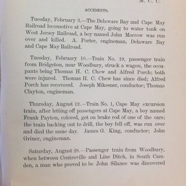 After a day of pleasant memories at the beach, they boarded the cars for the return. The first train left for a 6PM departure, followed by the second at 6:05PM. Seventeen miles from Atlantic City, they reached the town of Mays Landing during an evening rainstorm. After crossing the trestle over the Great Egg Harbor River, the lead train attempted to clear the single track for the down express by pulling over onto the siding. As the first train was still clearing the additional last two cars, the second locomotive telescoped the first in a rear end collision, erupting into a boiler explosion. In their panic, passengers broke through windows and jumped into the river below as others in the last car were scalded by the steam cylinder. With temperatures upwards of 200 degrees, the casualty list eventually climbed to a combined eighty injuries and fatalities. The accident scene overwhelmed the small community as the passengers outnumbered the town’s entire population. Unprepared for the extent of the calamity, neighbors then became unexpected first responders, while their homes were transformed into emergency rooms and morgues. Dozens of newspapers across the country carried the story, acknowledging the kindness extended by the citizens of Mays Landing. However, the story was squelched by New Jersey press outlets and ultimately veiled from the government agencies as well as history books. In an era when rails ruled the roads and class determined privilege, their story was mysteriously lost...until now.